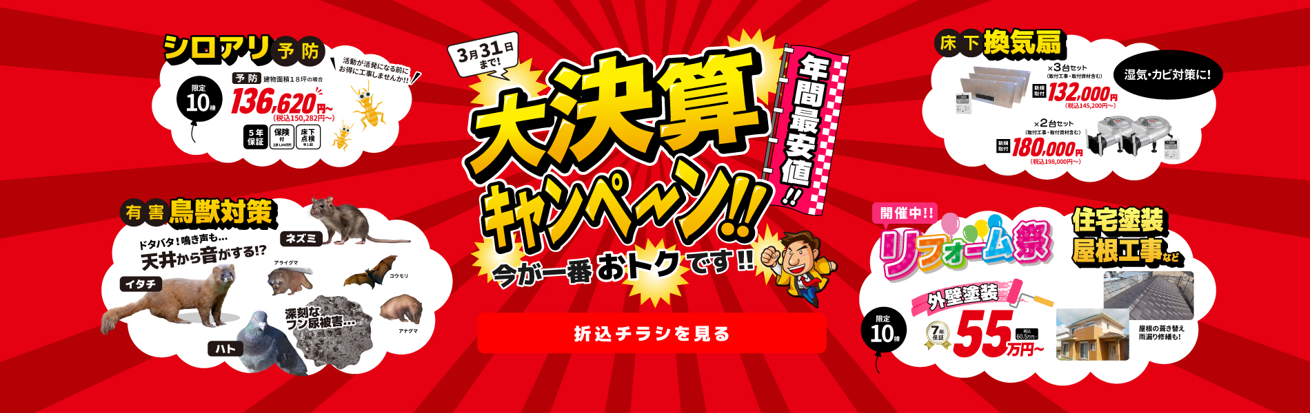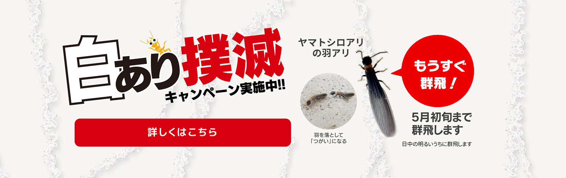- シロアリ駆除で契約したにも関わらず、万一契約期間中に効果が無かった場合は、契約金額を全額払い戻し致します。